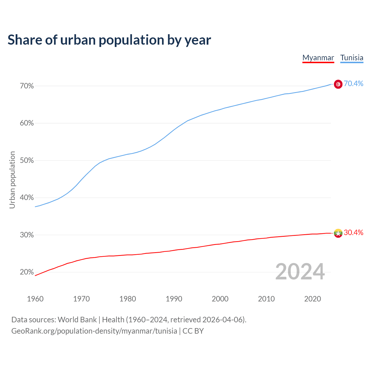 From 2004 to 2024, the share of urban population changed from 28.2% to 30.4% in Myanmar and from 64.9% to 70.4% in Tunisia.