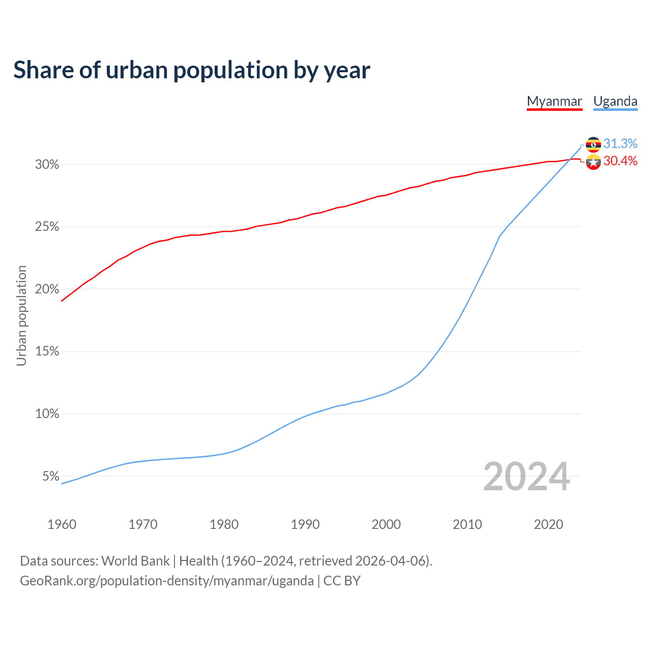 From 2004 to 2024, the share of urban population changed from 28.2% to 30.4% in Myanmar and from 13.1% to 31.3% in Uganda.