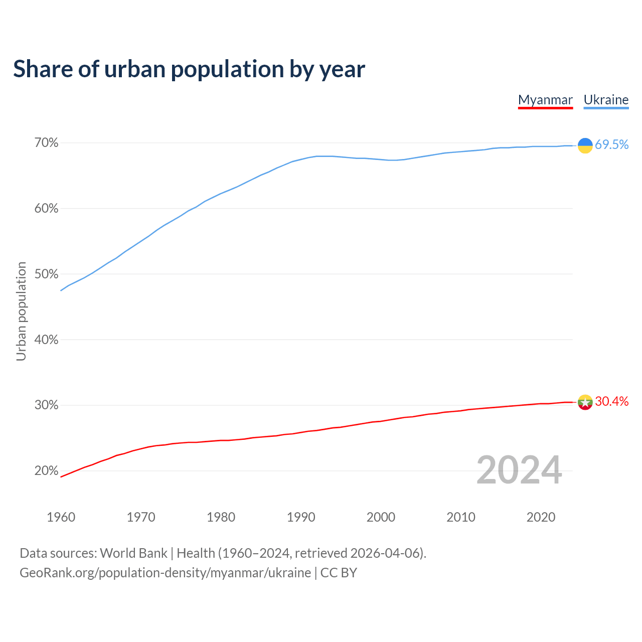 From 2006 to 2026, population density in Myanmar increased by 15.7%, compared to a 15.1% decline in Ukraine.