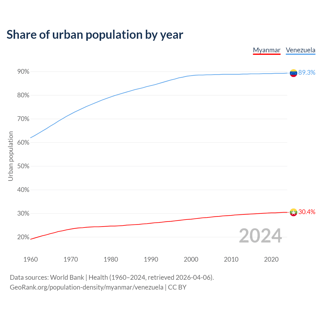 From 2004 to 2024, the share of urban population changed from 28.2% to 30.4% in Myanmar and from 88.6% to 89.3% in Venezuela.