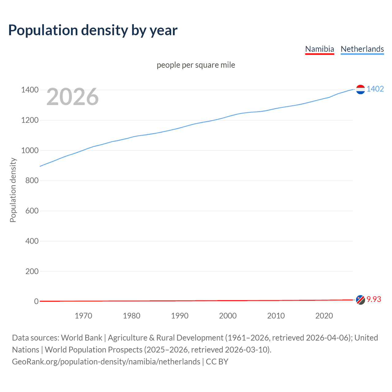 From 2006 to 2026, population density in Namibia increased by 58.5%, compared to a 11.8% growth in the Netherlands.