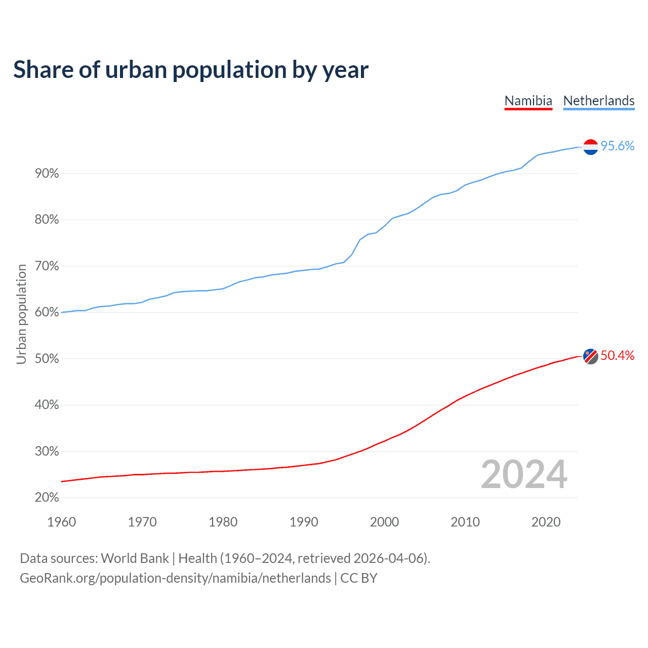 From 2004 to 2024, the share of urban population changed from 35.5% to 50.4% in Namibia and from 82.3% to 95.6% in the Netherlands.