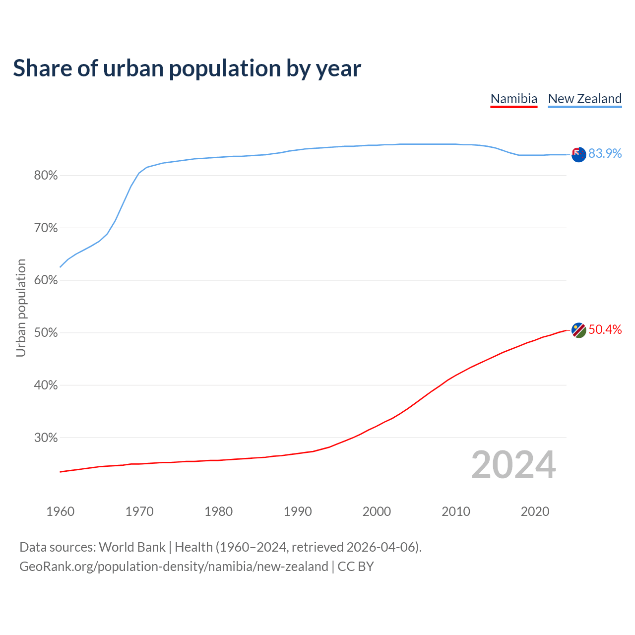 From 2004 to 2024, the share of urban population changed from 35.5% to 50.4% in Namibia and from 85.9% to 83.9% in New Zealand.