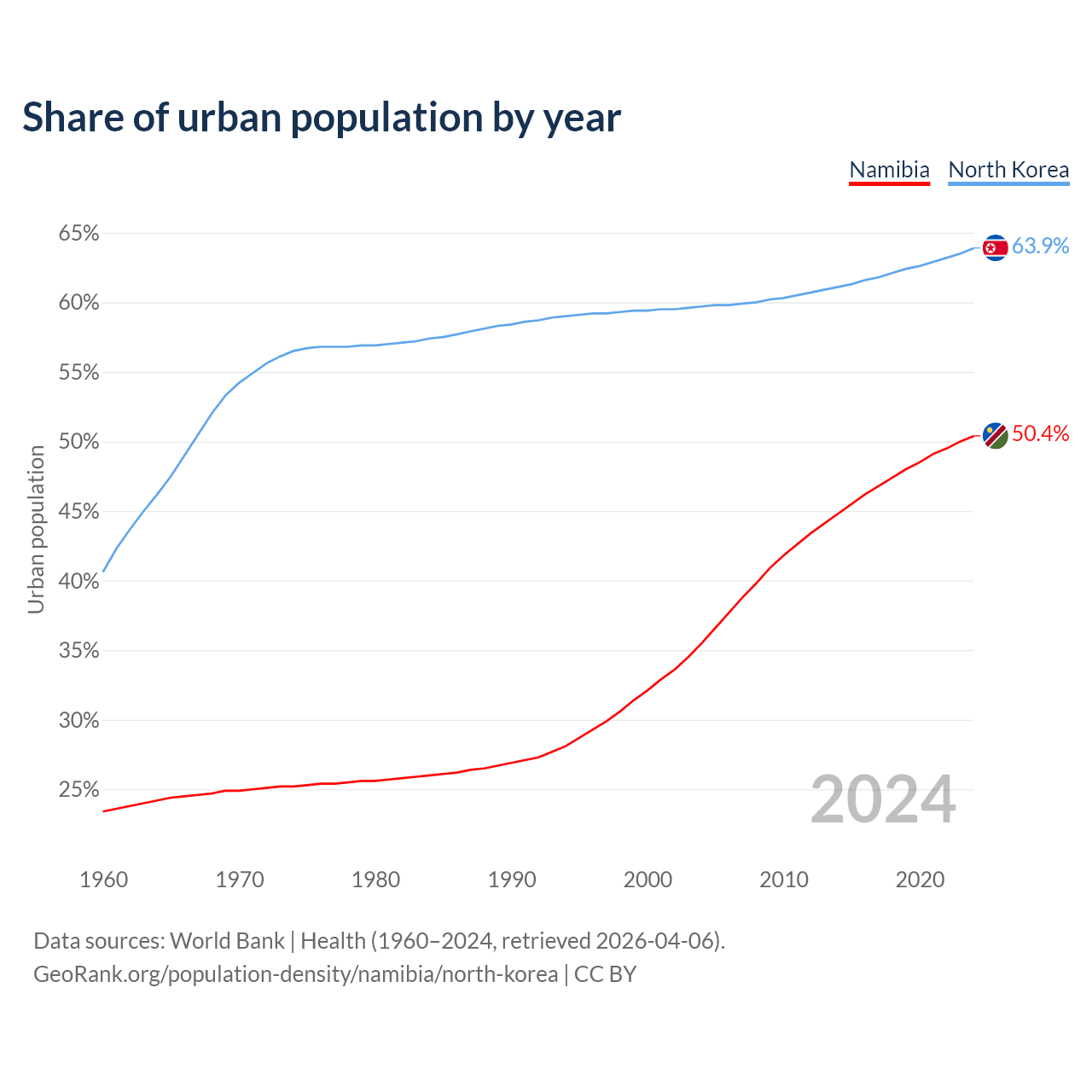 From 2004 to 2024, the share of urban population changed from 35.5% to 50.4% in Namibia and from 59.7% to 63.9% in North Korea.