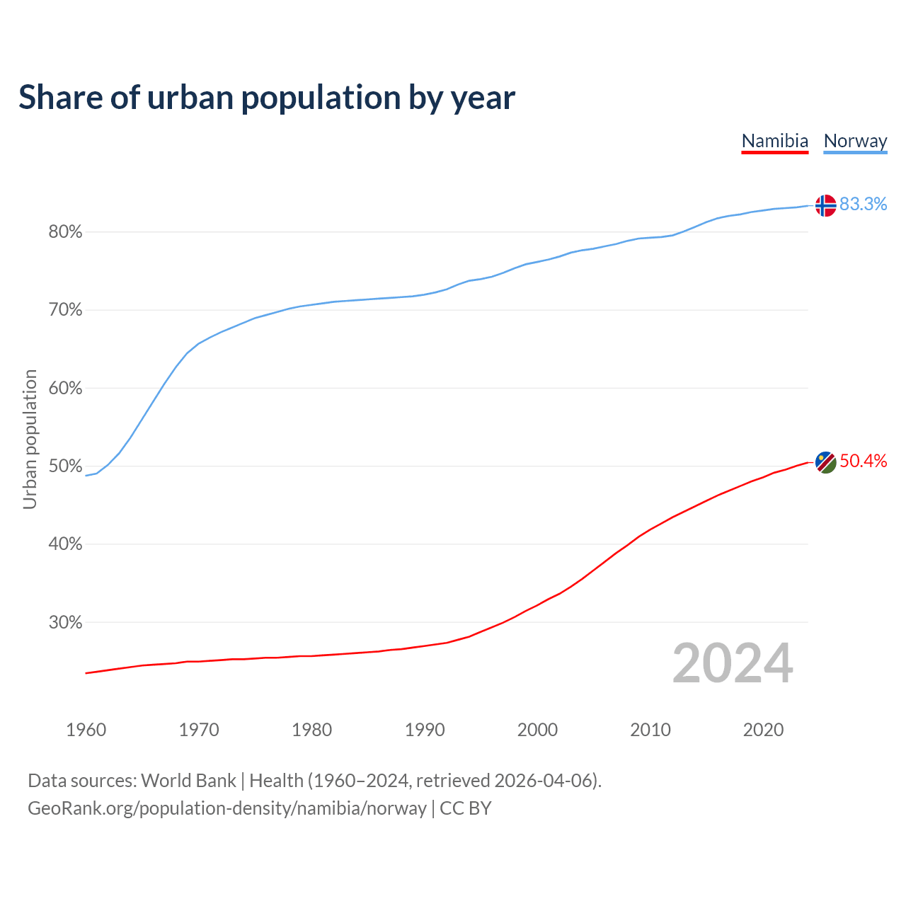From 2004 to 2024, the share of urban population changed from 35.5% to 50.4% in Namibia and from 77.6% to 83.3% in Norway.