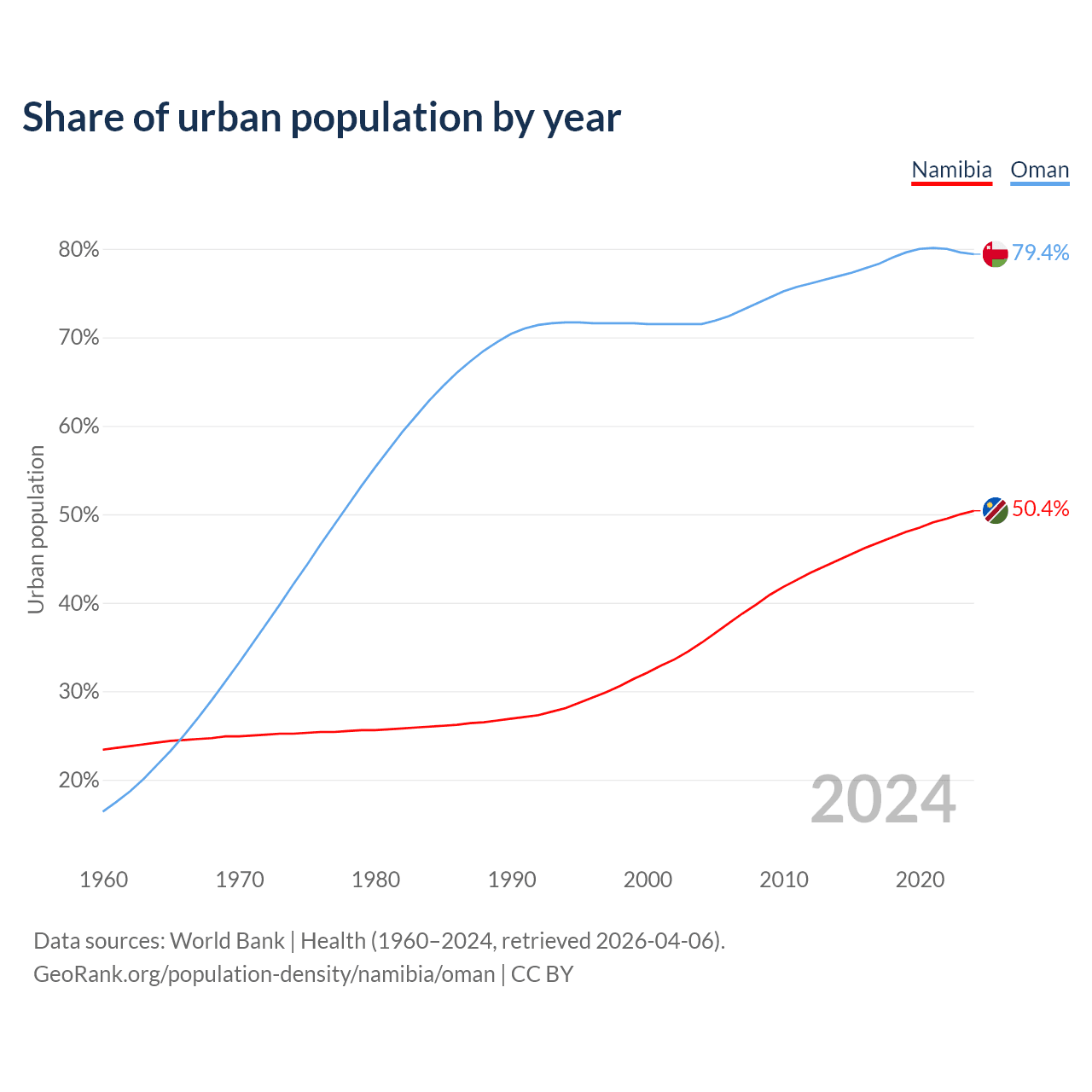 From 2004 to 2024, the share of urban population changed from 35.5% to 50.4% in Namibia and from 71.5% to 79.4% in Oman.