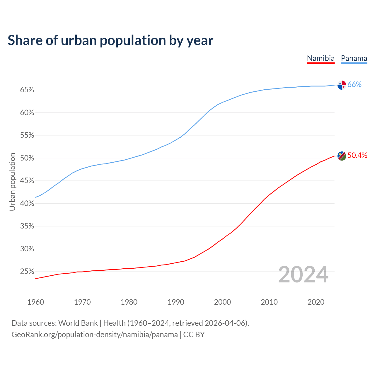 From 2004 to 2024, the share of urban population changed from 35.5% to 50.4% in Namibia and from 63.8% to 66% in Panama.