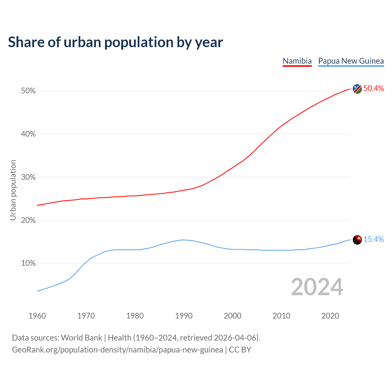 From 2004 to 2024, the share of urban population changed from 35.5% to 50.4% in Namibia and from 13.1% to 15.4% in Papua New Guinea.