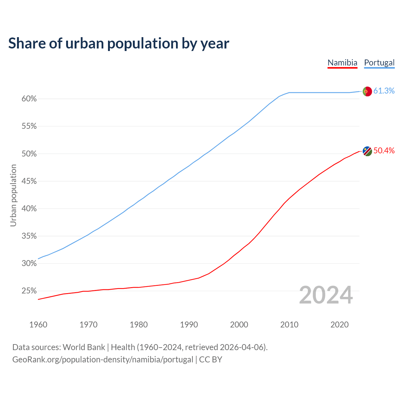 From 2004 to 2024, the share of urban population changed from 35.5% to 50.4% in Namibia and from 57.4% to 61.3% in Portugal.