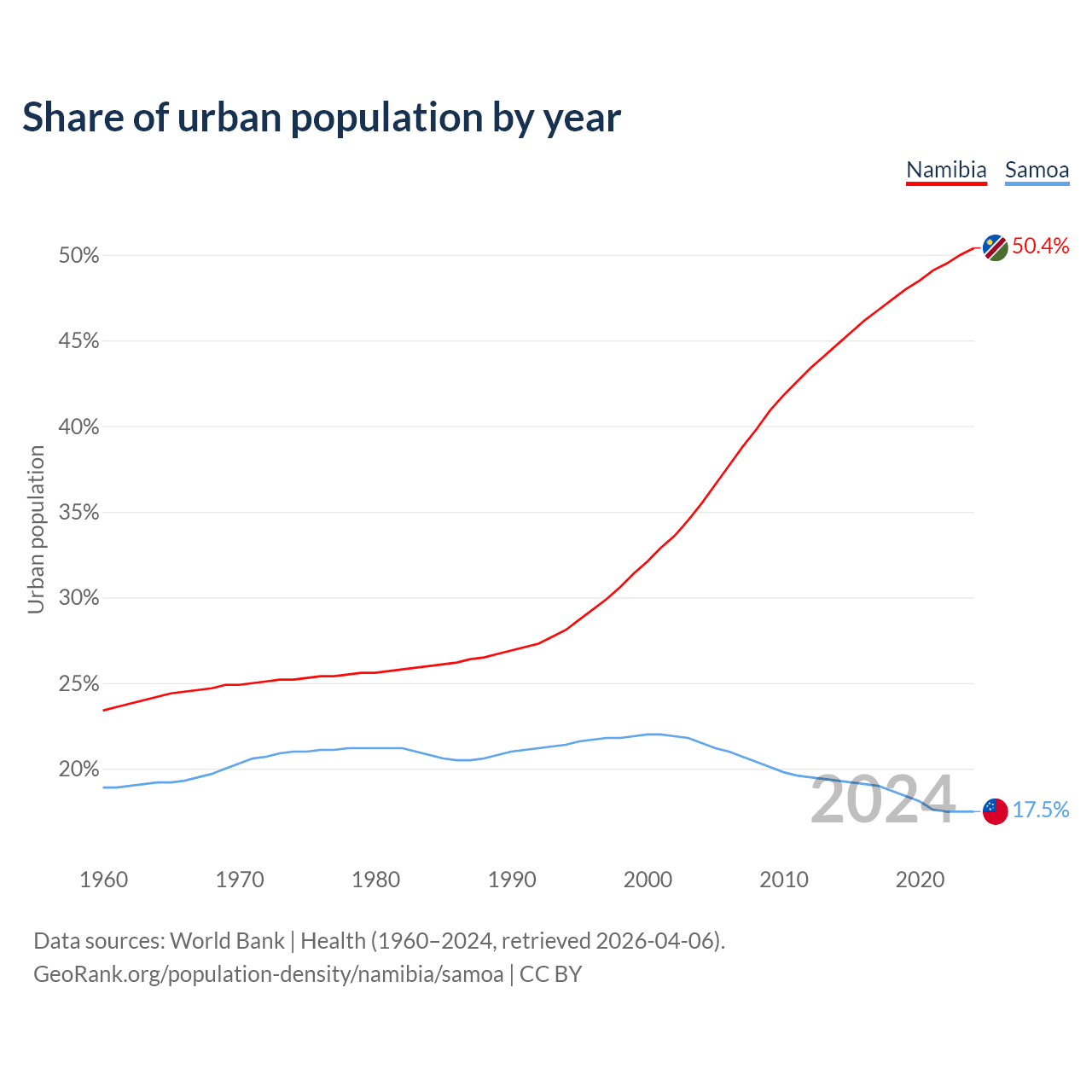 From 2006 to 2026, population density in Namibia increased by 58.5%, compared to a 19.6% growth in Samoa.