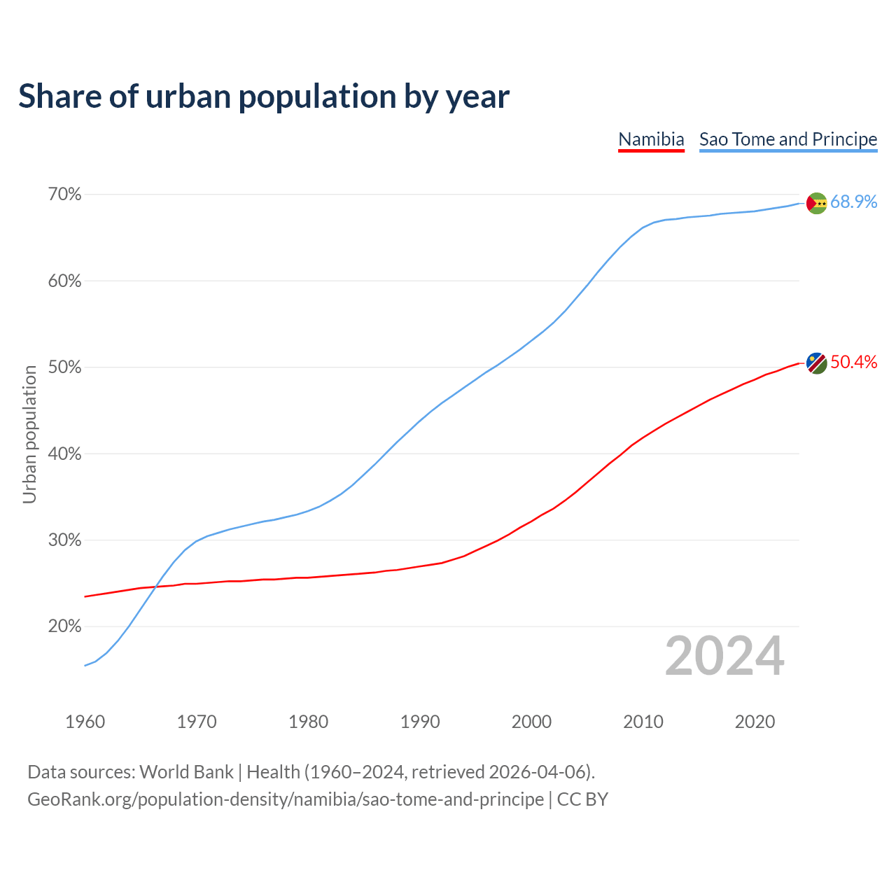 From 2004 to 2024, the share of urban population changed from 35.5% to 50.4% in Namibia and from 57.9% to 68.9% in Sao Tome and Principe.