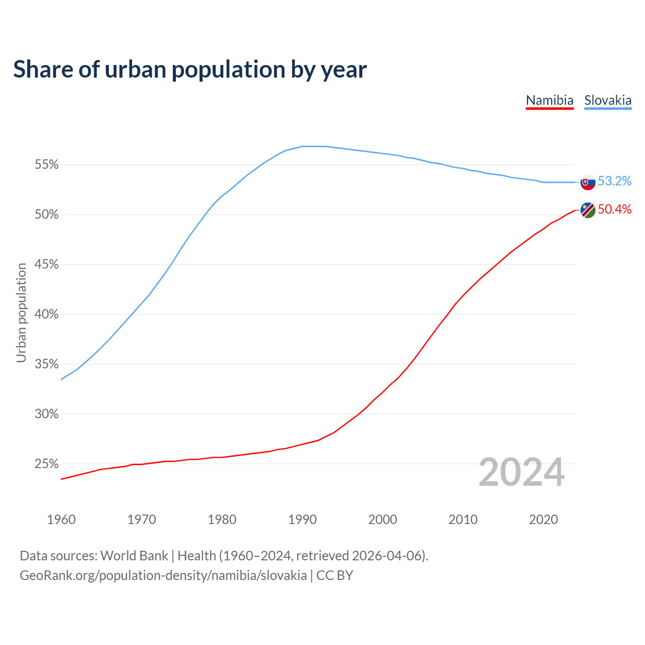 From 2004 to 2024, the share of urban population changed from 35.5% to 50.4% in Namibia and from 55.6% to 53.2% in Slovakia.