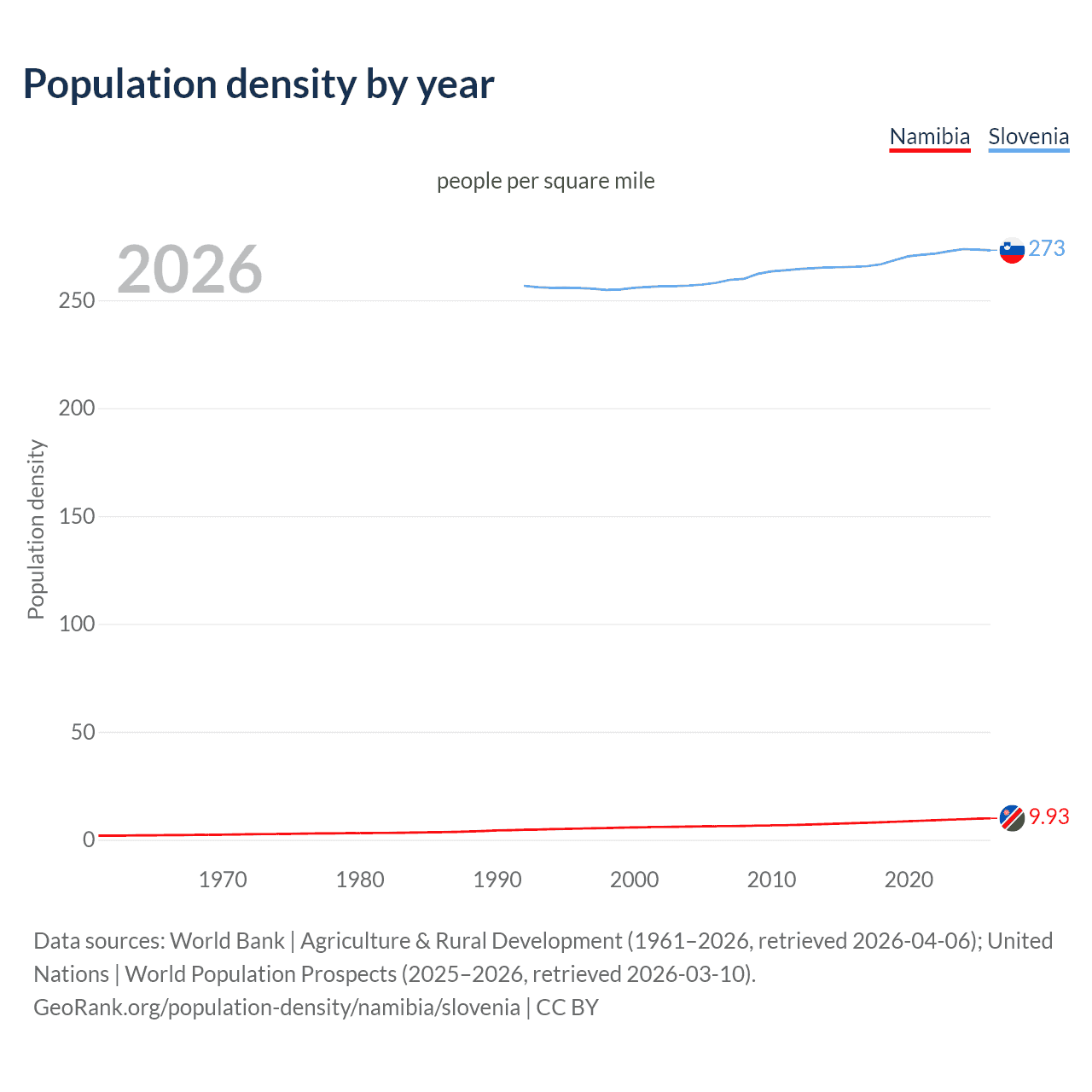 From 2006 to 2026, population density in Namibia increased by 58.5%, compared to a 5.87% growth in Slovenia.