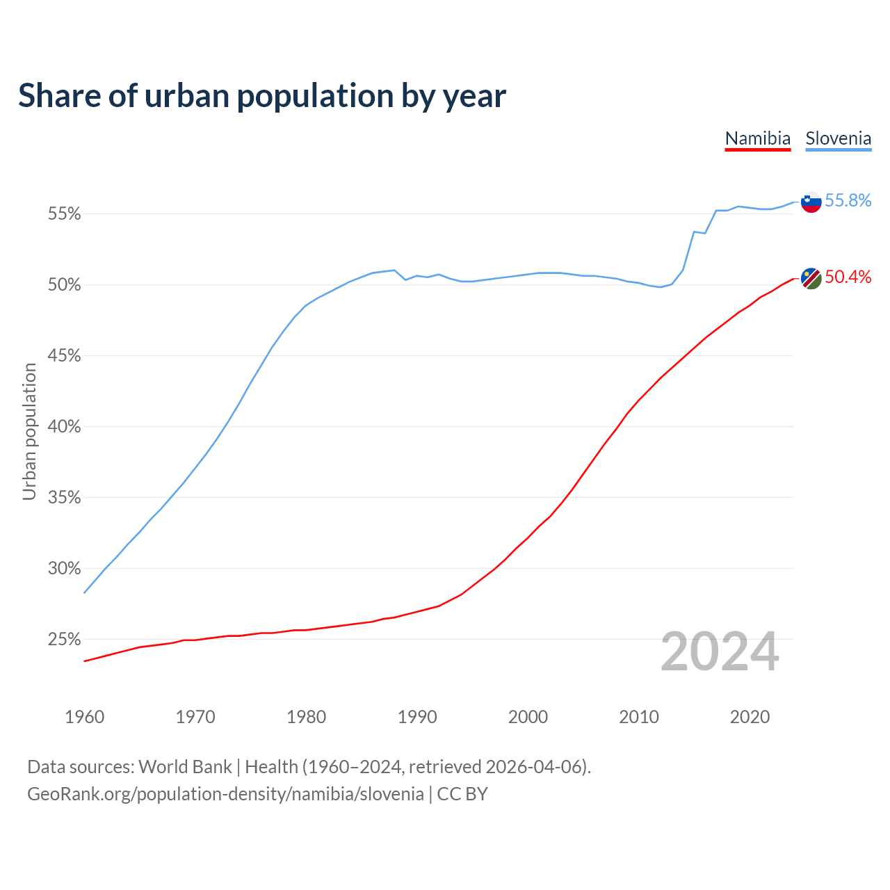 From 2004 to 2024, the share of urban population changed from 35.5% to 50.4% in Namibia and from 50.7% to 55.8% in Slovenia.