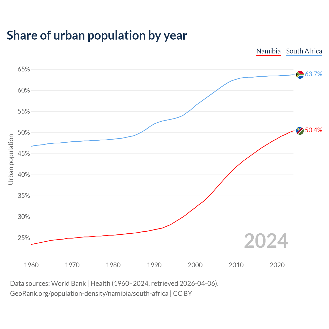 From 2004 to 2024, the share of urban population changed from 35.5% to 50.4% in Namibia and from 59.1% to 63.7% in South Africa.