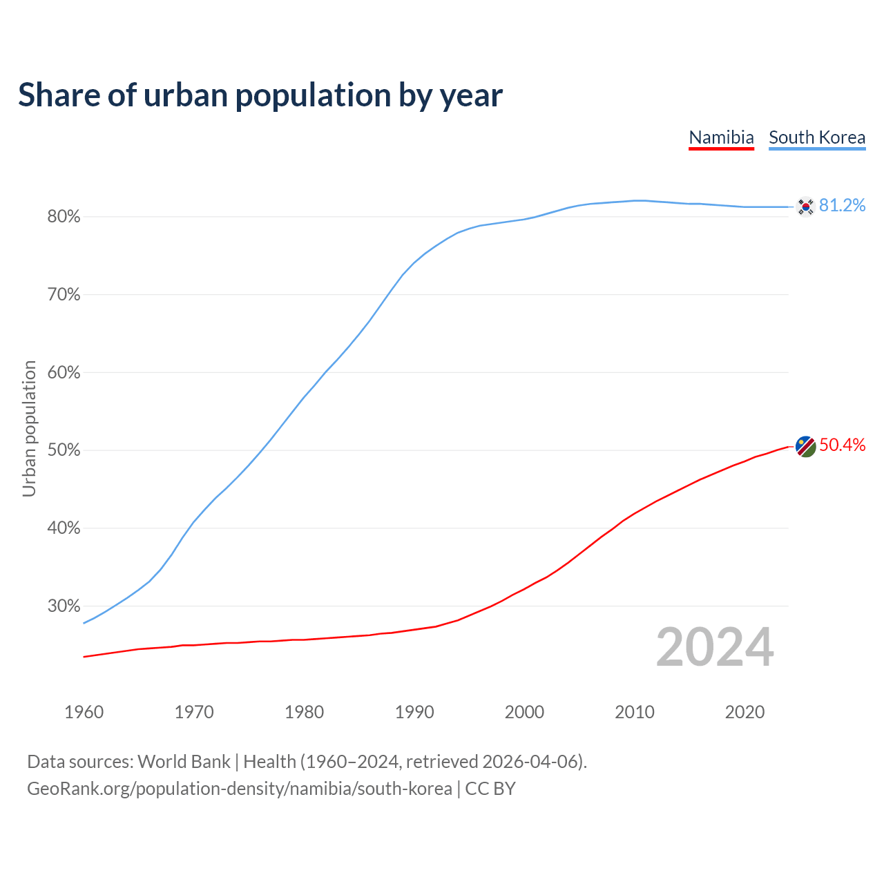 From 2004 to 2024, the share of urban population changed from 35.5% to 50.4% in Namibia and from 81.1% to 81.2% in South Korea.
