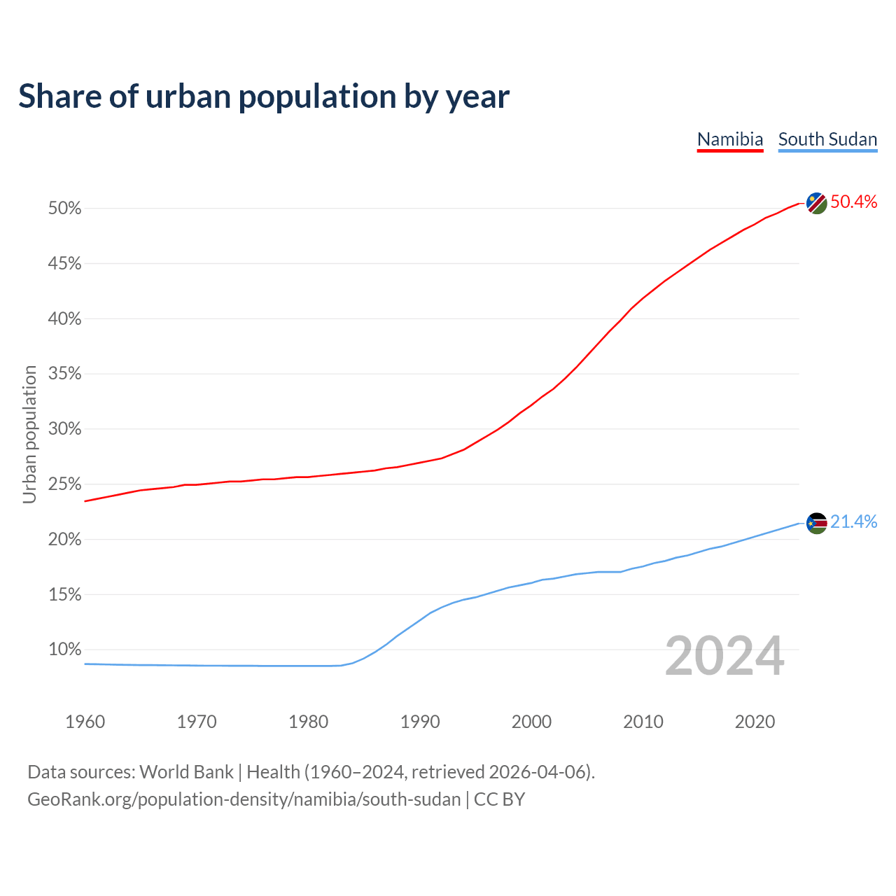 From 2004 to 2024, the share of urban population changed from 35.5% to 50.4% in Namibia and from 16.8% to 21.4% in South Sudan.