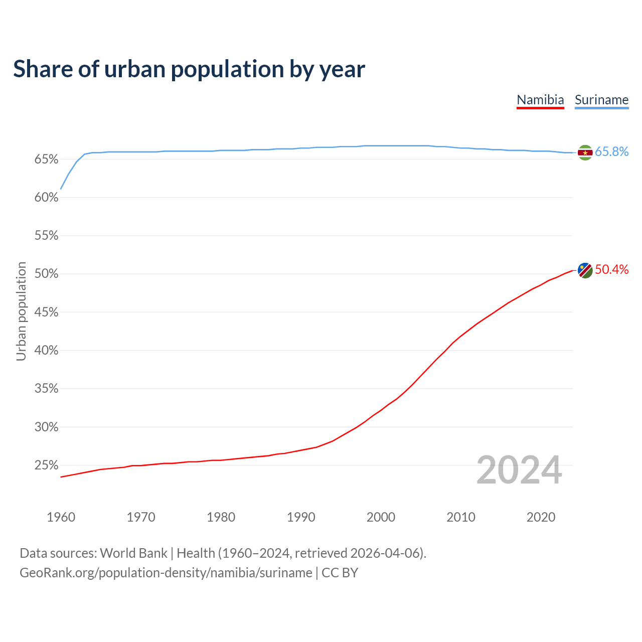 From 2004 to 2024, the share of urban population changed from 35.5% to 50.4% in Namibia and from 66.7% to 65.8% in Suriname.