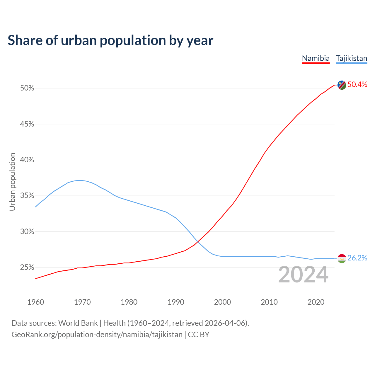 From 2004 to 2024, the share of urban population changed from 35.5% to 50.4% in Namibia and from 26.5% to 26.2% in Tajikistan.