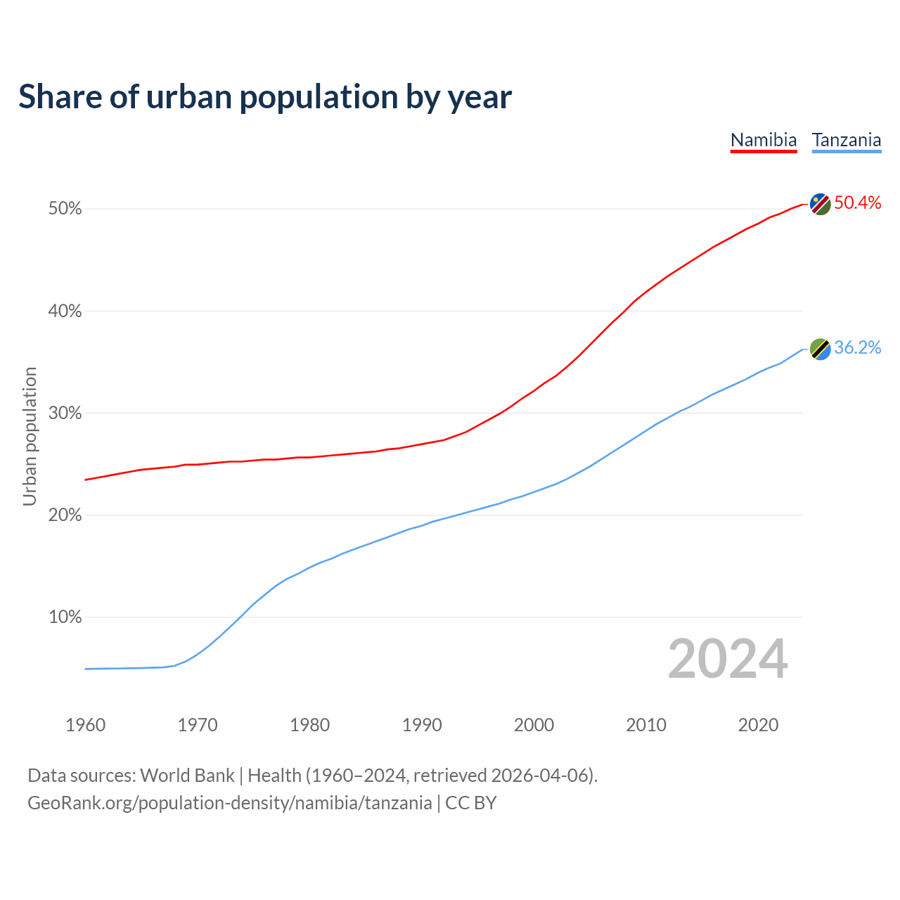 From 2004 to 2024, the share of urban population changed from 35.5% to 50.4% in Namibia and from 24.1% to 36.2% in Tanzania.