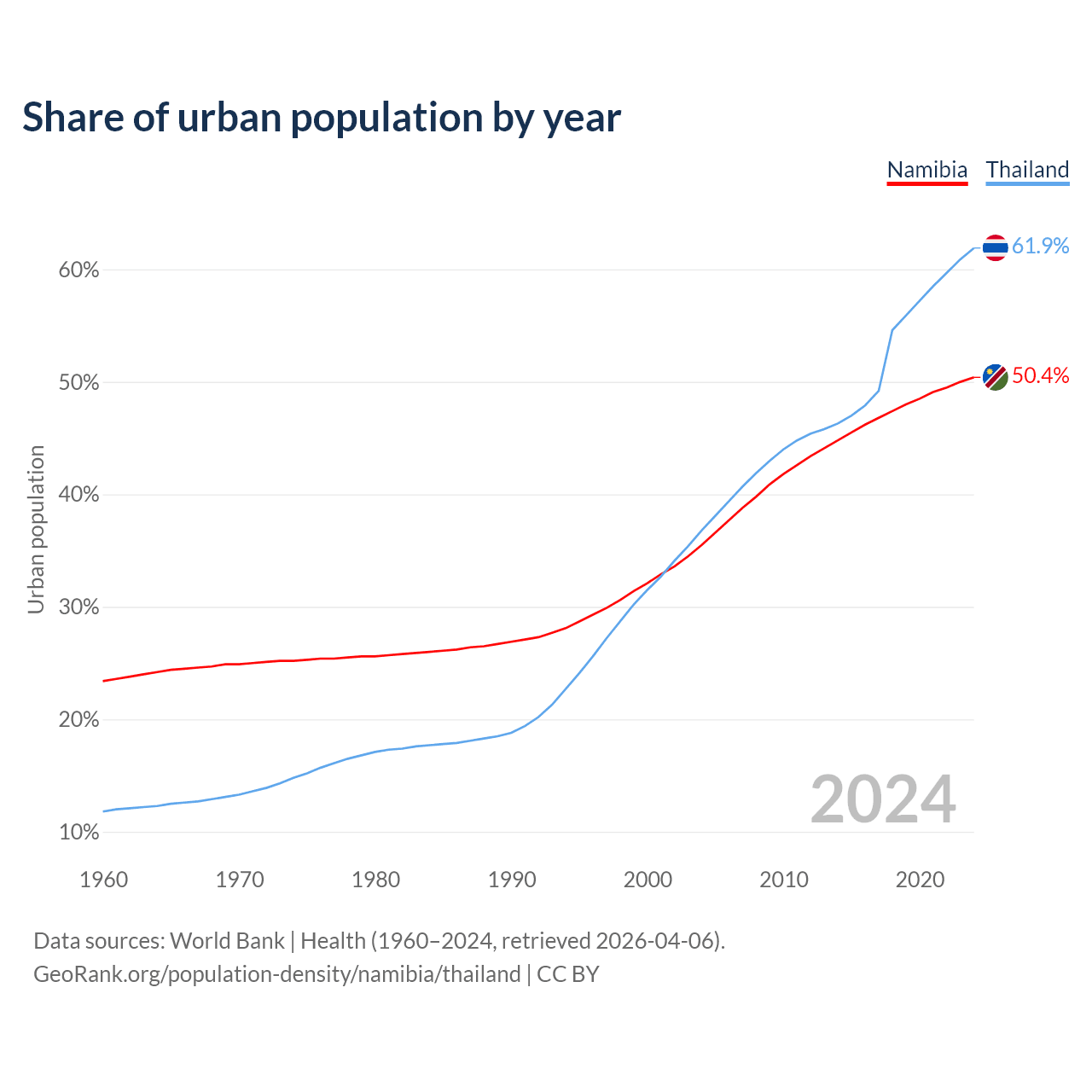 From 2004 to 2024, the share of urban population changed from 35.5% to 50.4% in Namibia and from 36.8% to 61.9% in Thailand.