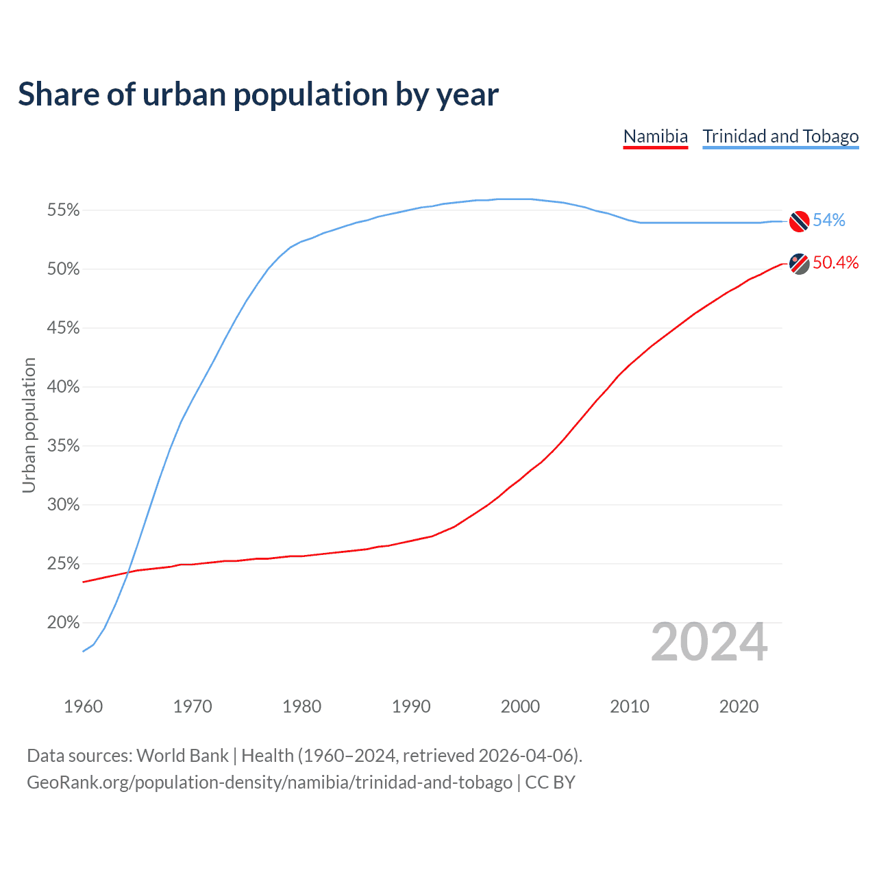 From 2004 to 2024, the share of urban population changed from 35.5% to 50.4% in Namibia and from 55.6% to 54% in Trinidad and Tobago.