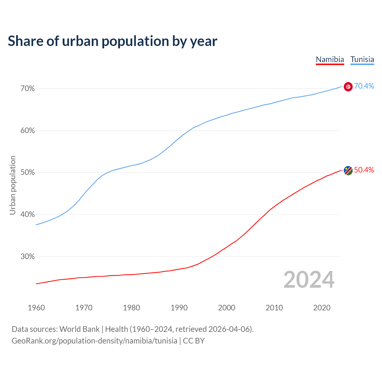 From 2004 to 2024, the share of urban population changed from 35.5% to 50.4% in Namibia and from 64.9% to 70.4% in Tunisia.