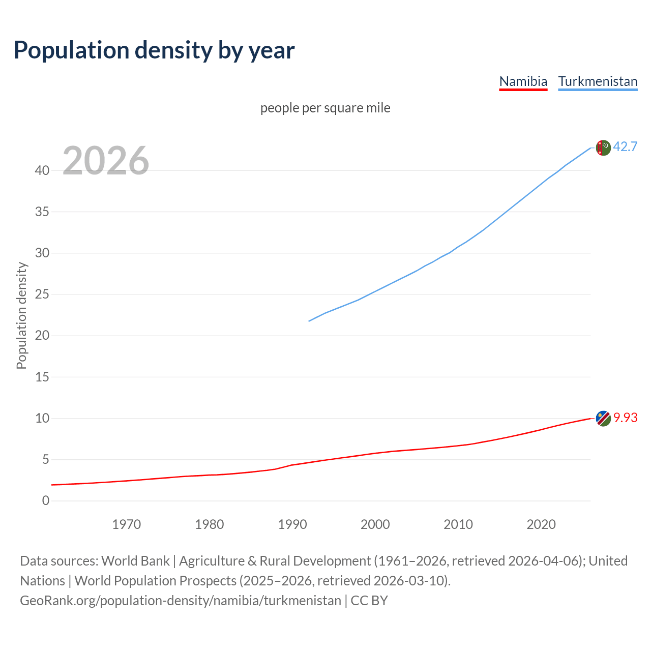 From 2006 to 2026, population density in Namibia increased by 58.5%, compared to a 50.5% growth in Turkmenistan.