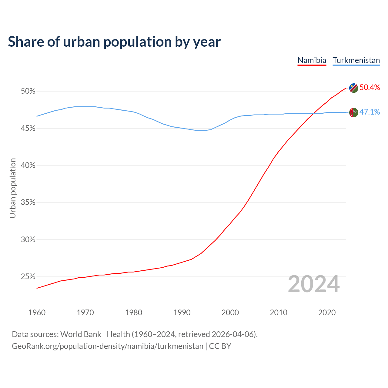 From 2004 to 2024, the share of urban population changed from 35.5% to 50.4% in Namibia and from 46.7% to 47.1% in Turkmenistan.