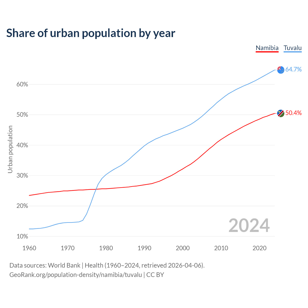 From 2004 to 2024, the share of urban population changed from 35.5% to 50.4% in Namibia and from 48.4% to 64.7% in Tuvalu.