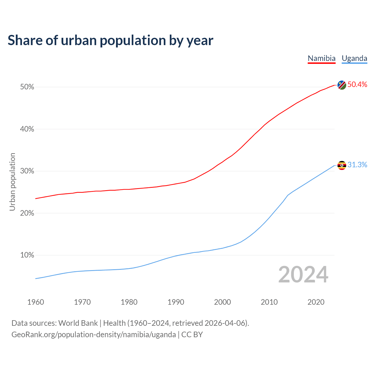 From 2004 to 2024, the share of urban population changed from 35.5% to 50.4% in Namibia and from 13.1% to 31.3% in Uganda.