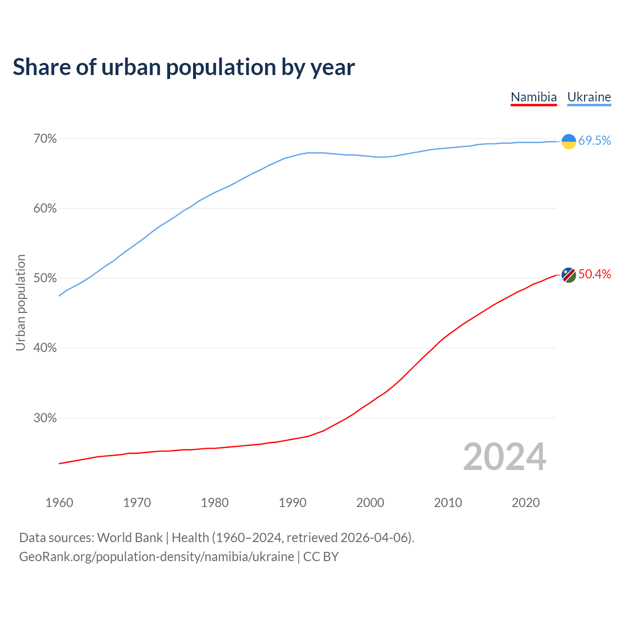 From 2004 to 2024, the share of urban population changed from 35.5% to 50.4% in Namibia and from 67.6% to 69.5% in Ukraine.