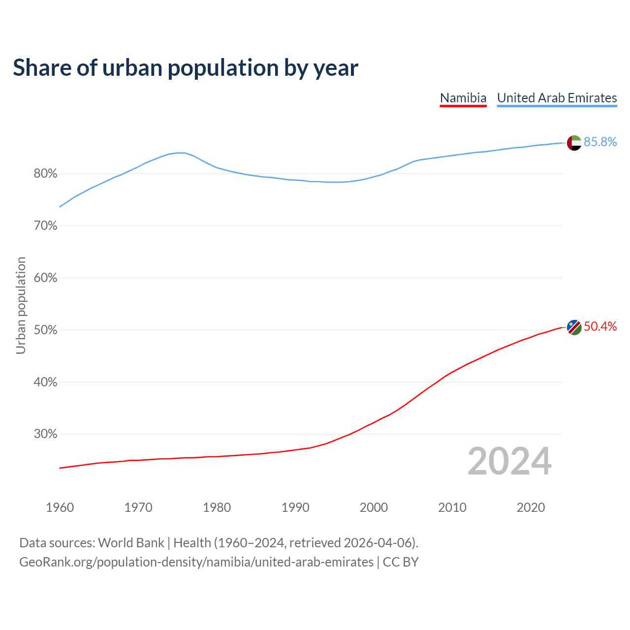 From 2004 to 2024, the share of urban population changed from 35.5% to 50.4% in Namibia and from 81.5% to 85.8% in the United Arab Emirates.