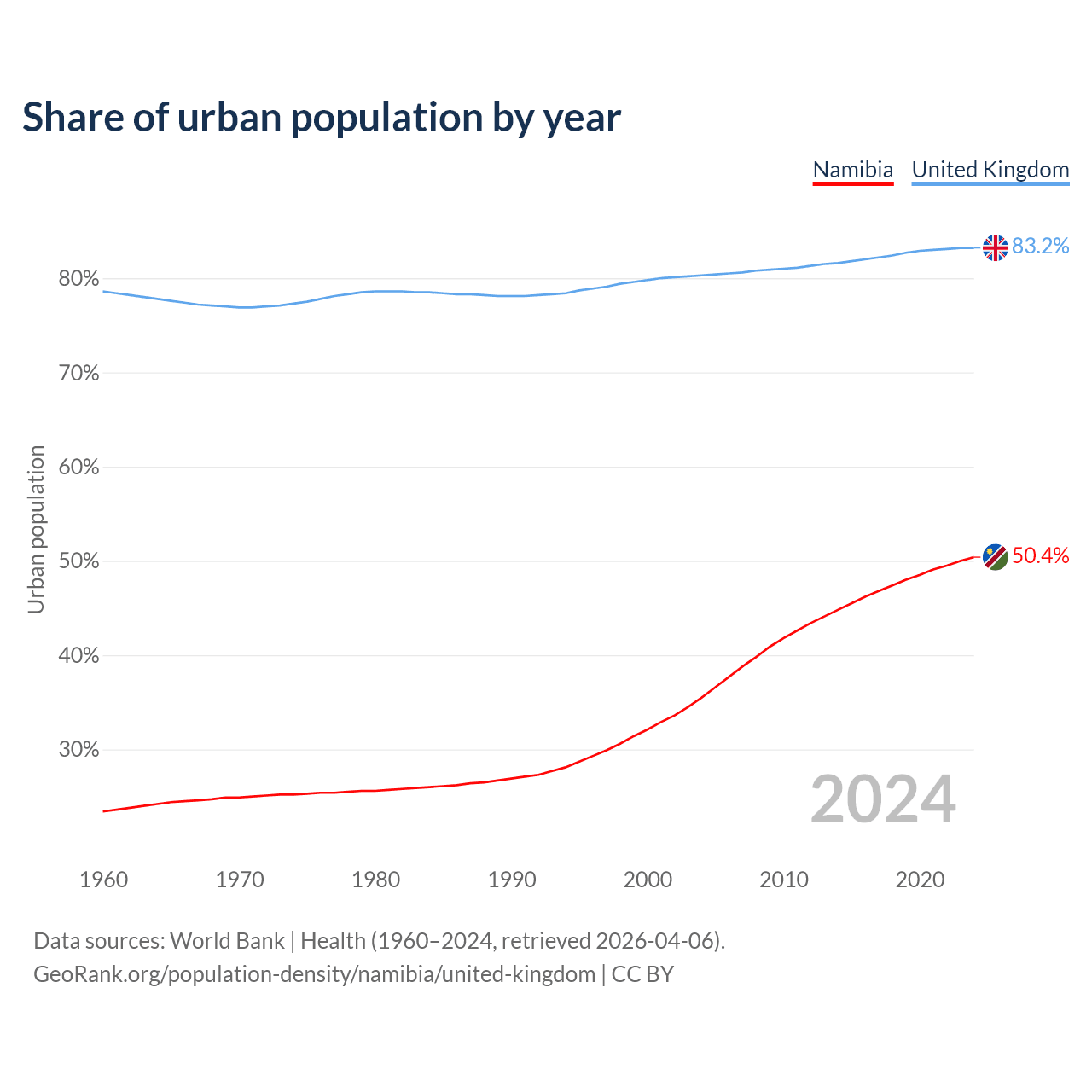 From 2004 to 2024, the share of urban population changed from 35.5% to 50.4% in Namibia and from 80.3% to 83.2% in the United Kingdom.