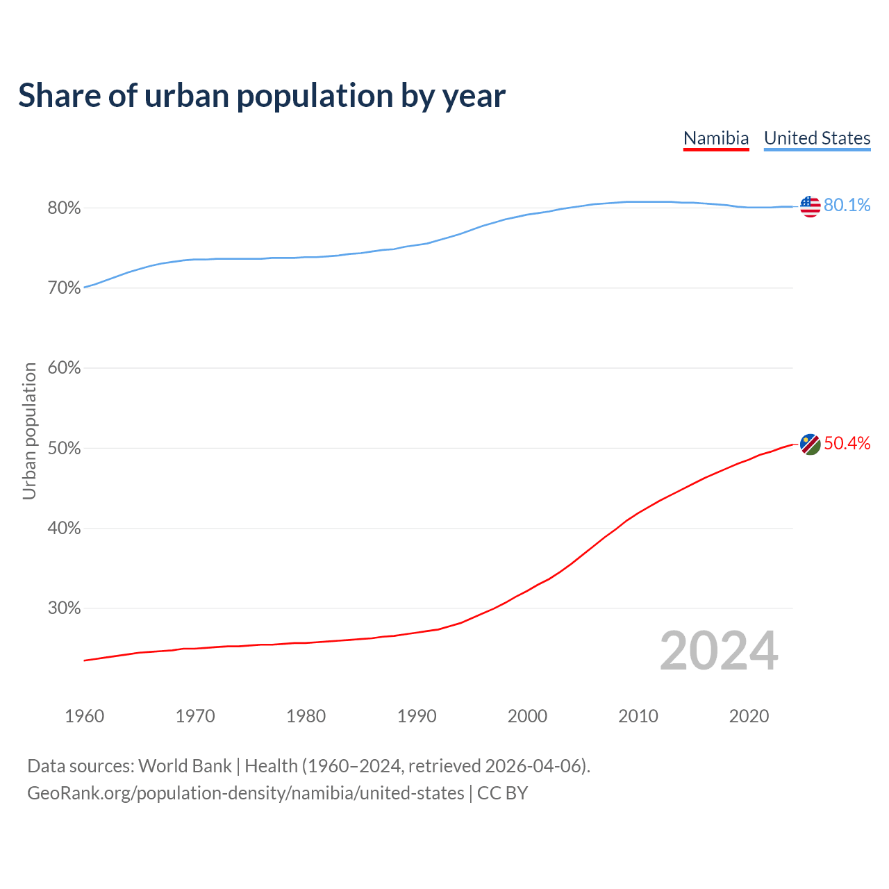 From 2004 to 2024, the share of urban population changed from 35.5% to 50.4% in Namibia and from 80% to 80.1% in the United States.