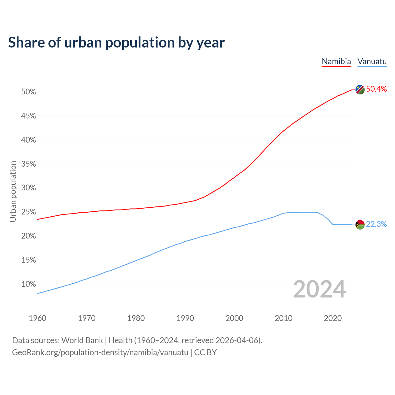 From 2004 to 2024, the share of urban population changed from 35.5% to 50.4% in Namibia and from 22.7% to 22.3% in Vanuatu.