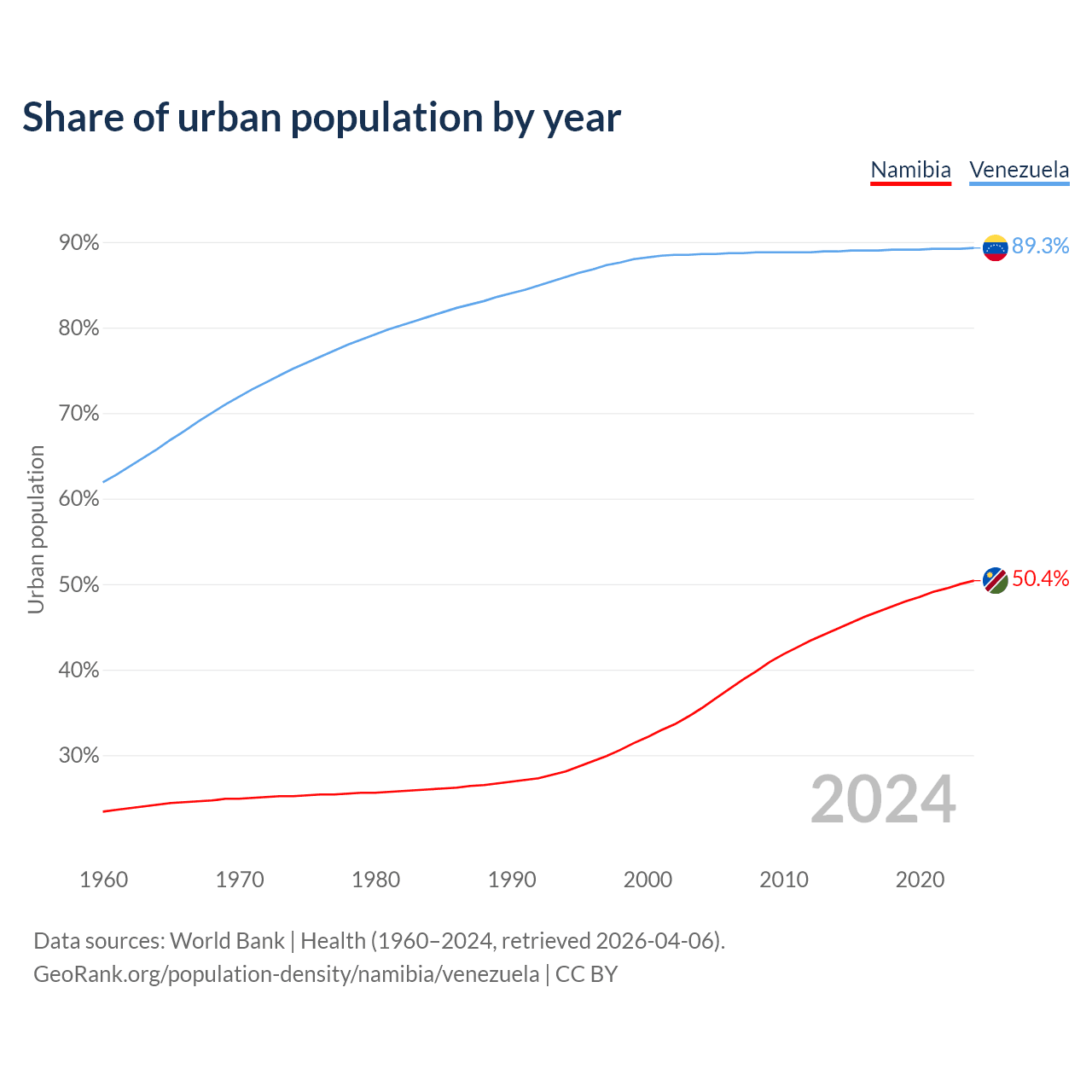 From 2004 to 2024, the share of urban population changed from 35.5% to 50.4% in Namibia and from 88.6% to 89.3% in Venezuela.