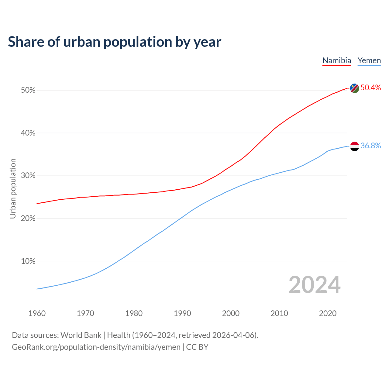 From 2004 to 2024, the share of urban population changed from 35.5% to 50.4% in Namibia and from 28.5% to 36.8% in Yemen.