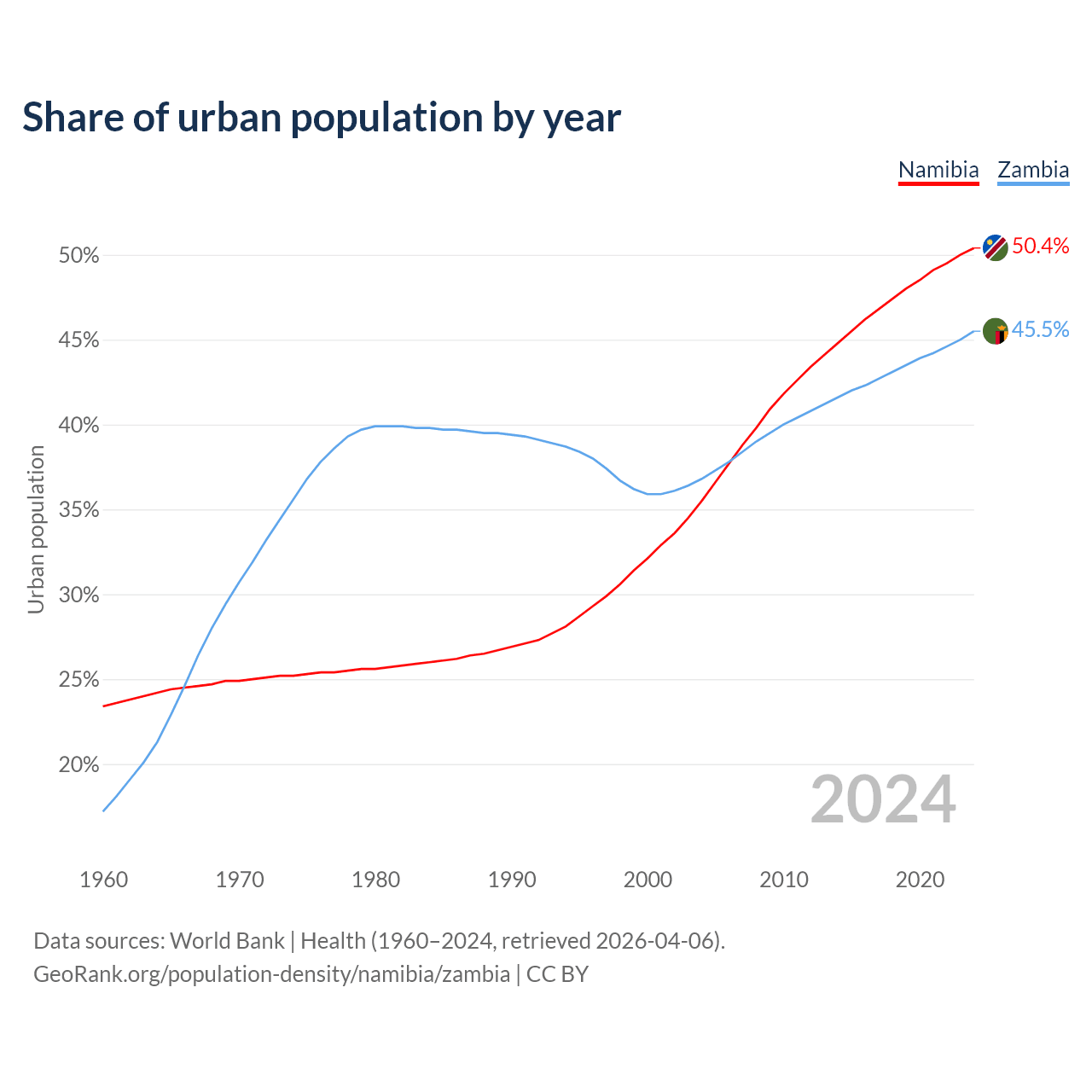 From 2004 to 2024, the share of urban population changed from 35.5% to 50.4% in Namibia and from 36.8% to 45.5% in Zambia.