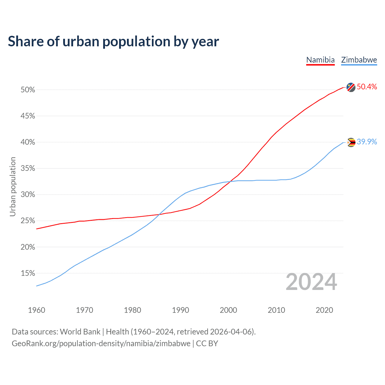 From 2004 to 2024, the share of urban population changed from 35.5% to 50.4% in Namibia and from 32.6% to 39.9% in Zimbabwe.