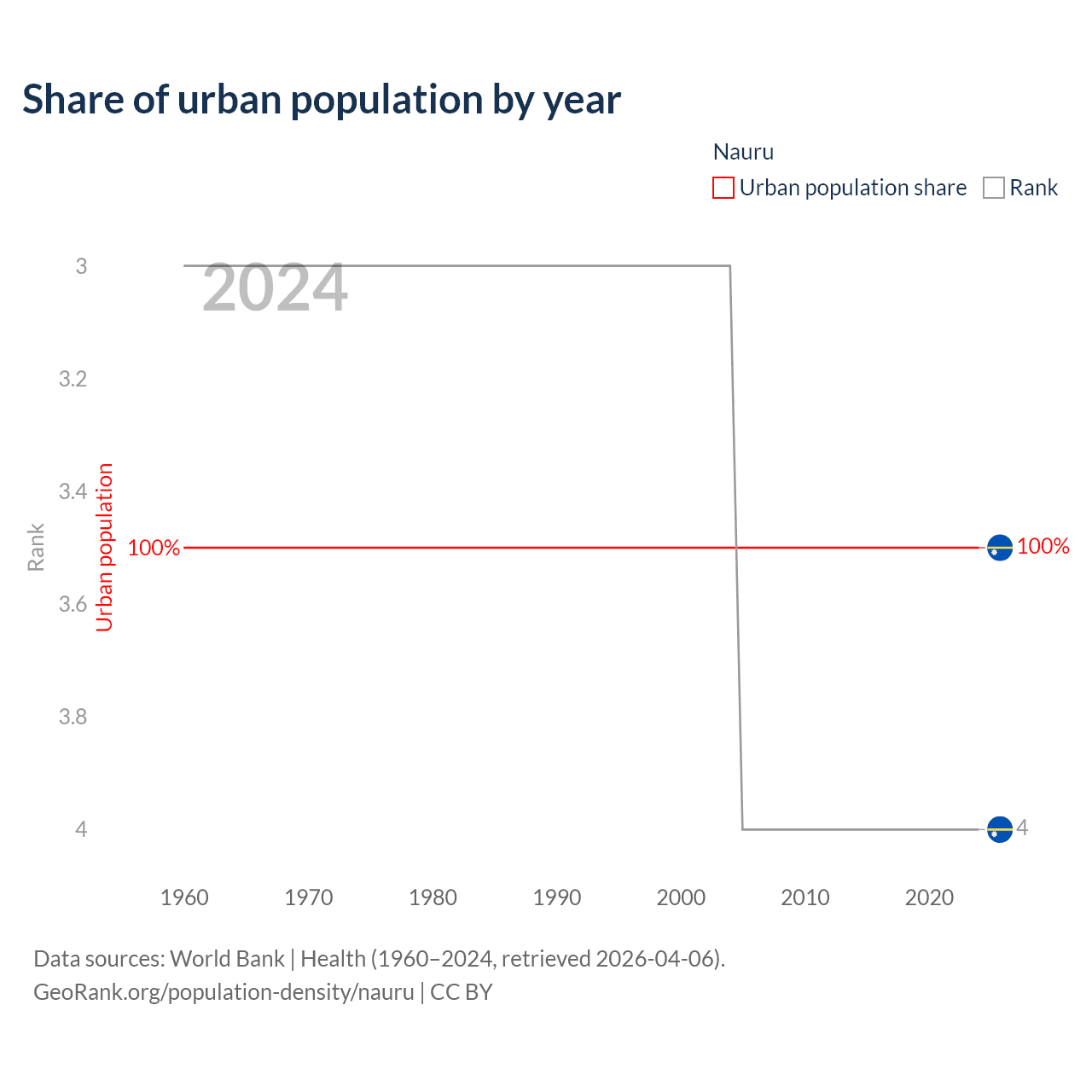 This chart shows the share of urban population in Nauru from 1960 to 2024: 100% lived in urban areas in 1960, 100% in 2000, and 100% in 2024.