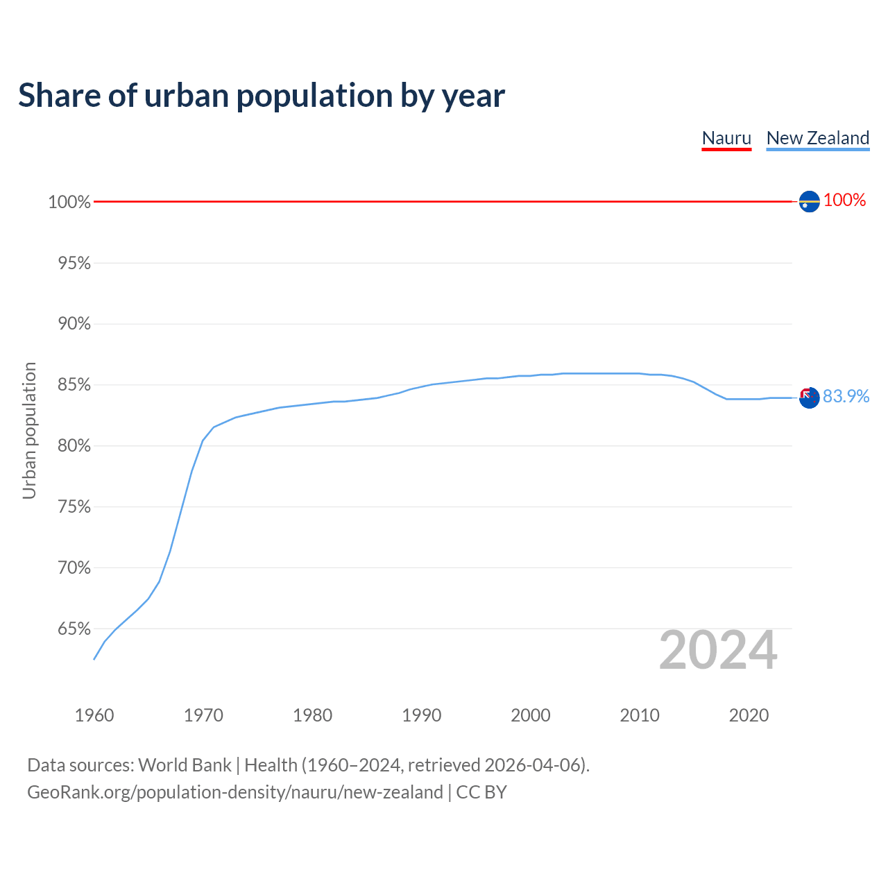 From 2004 to 2024, the share of urban population changed from 100% to 100% in Nauru and from 85.9% to 83.9% in New Zealand.