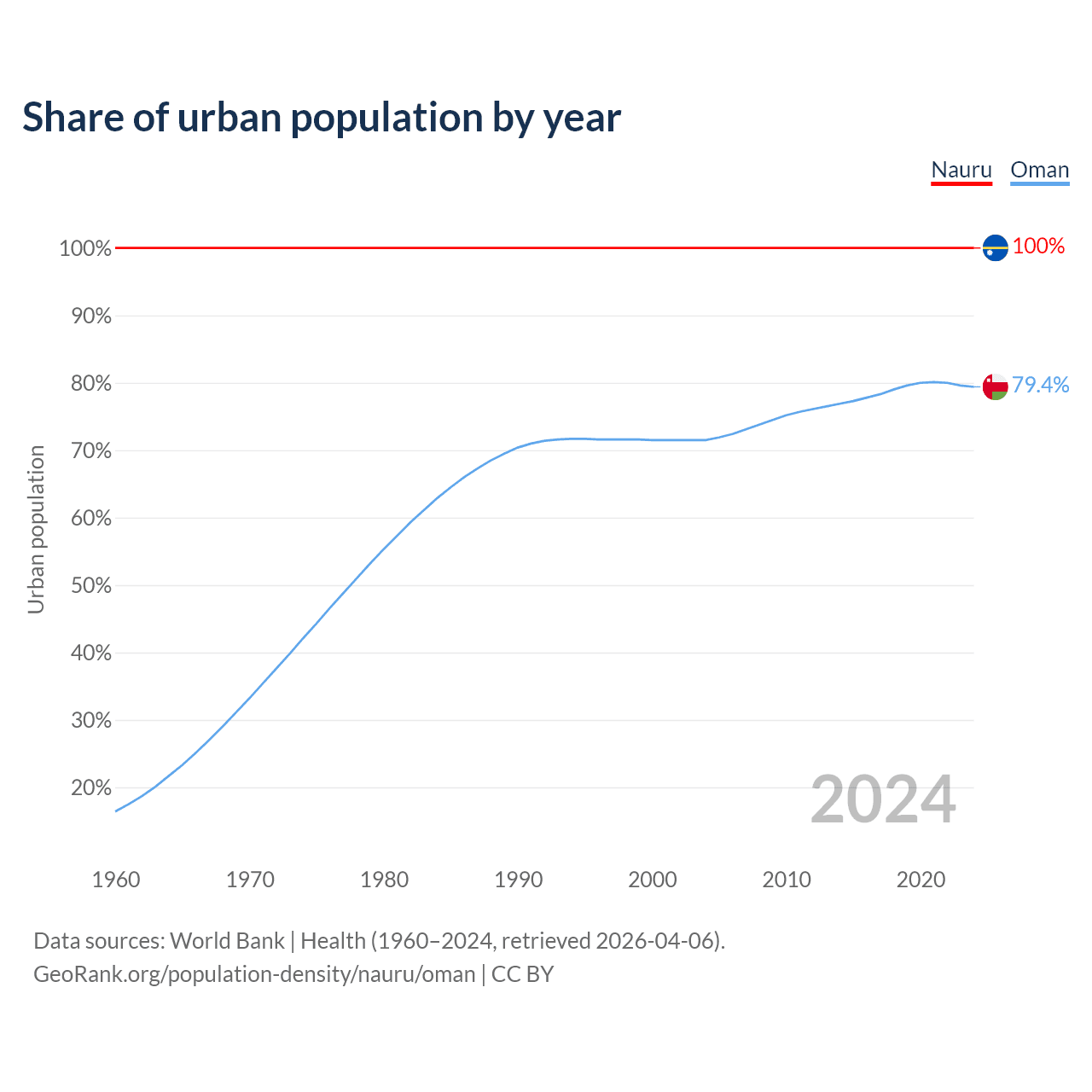 From 2004 to 2024, the share of urban population changed from 100% to 100% in Nauru and from 71.5% to 79.4% in Oman.