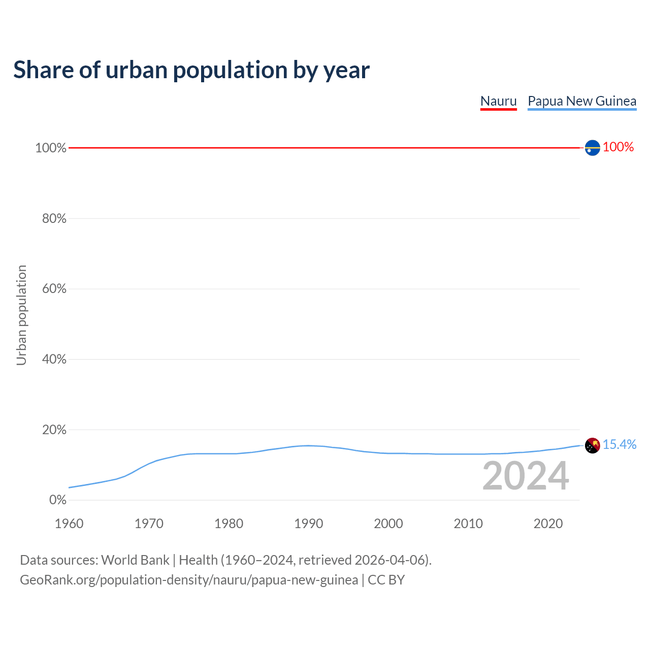 From 2004 to 2024, the share of urban population changed from 100% to 100% in Nauru and from 13.1% to 15.4% in Papua New Guinea.