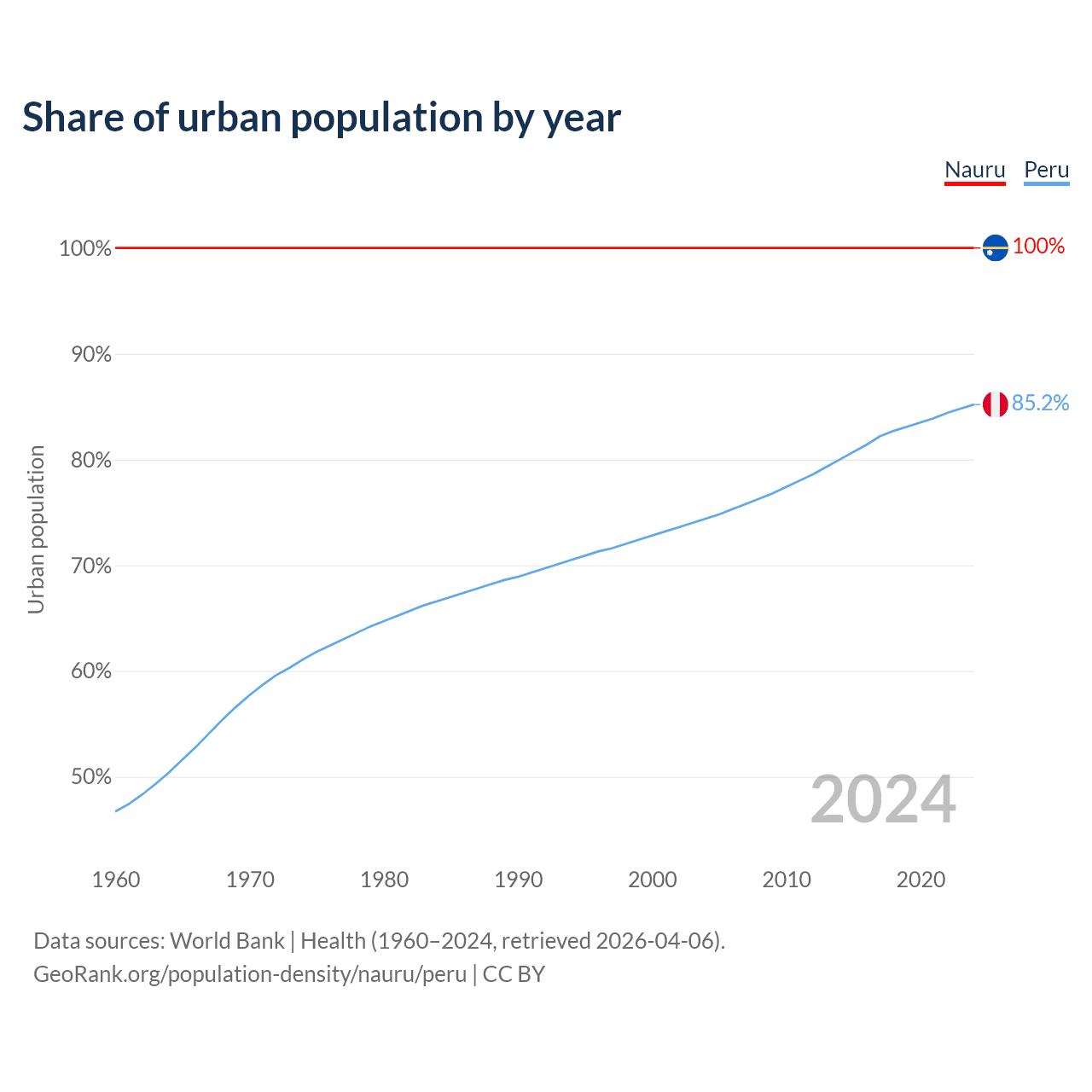 From 2004 to 2024, the share of urban population changed from 100% to 100% in Nauru and from 74.4% to 85.2% in Peru.