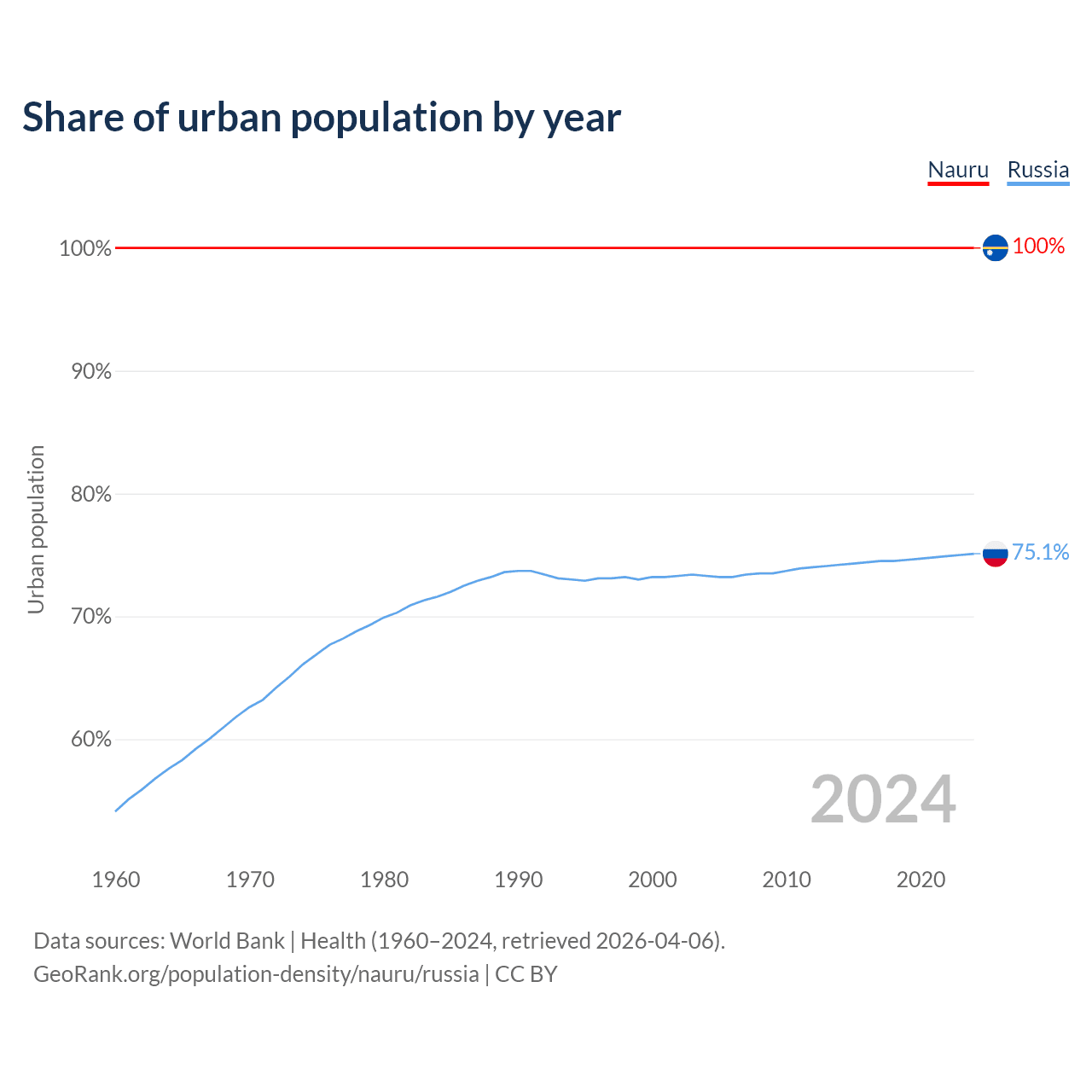 From 2004 to 2024, the share of urban population changed from 100% to 100% in Nauru and from 73.3% to 75.1% in Russia.