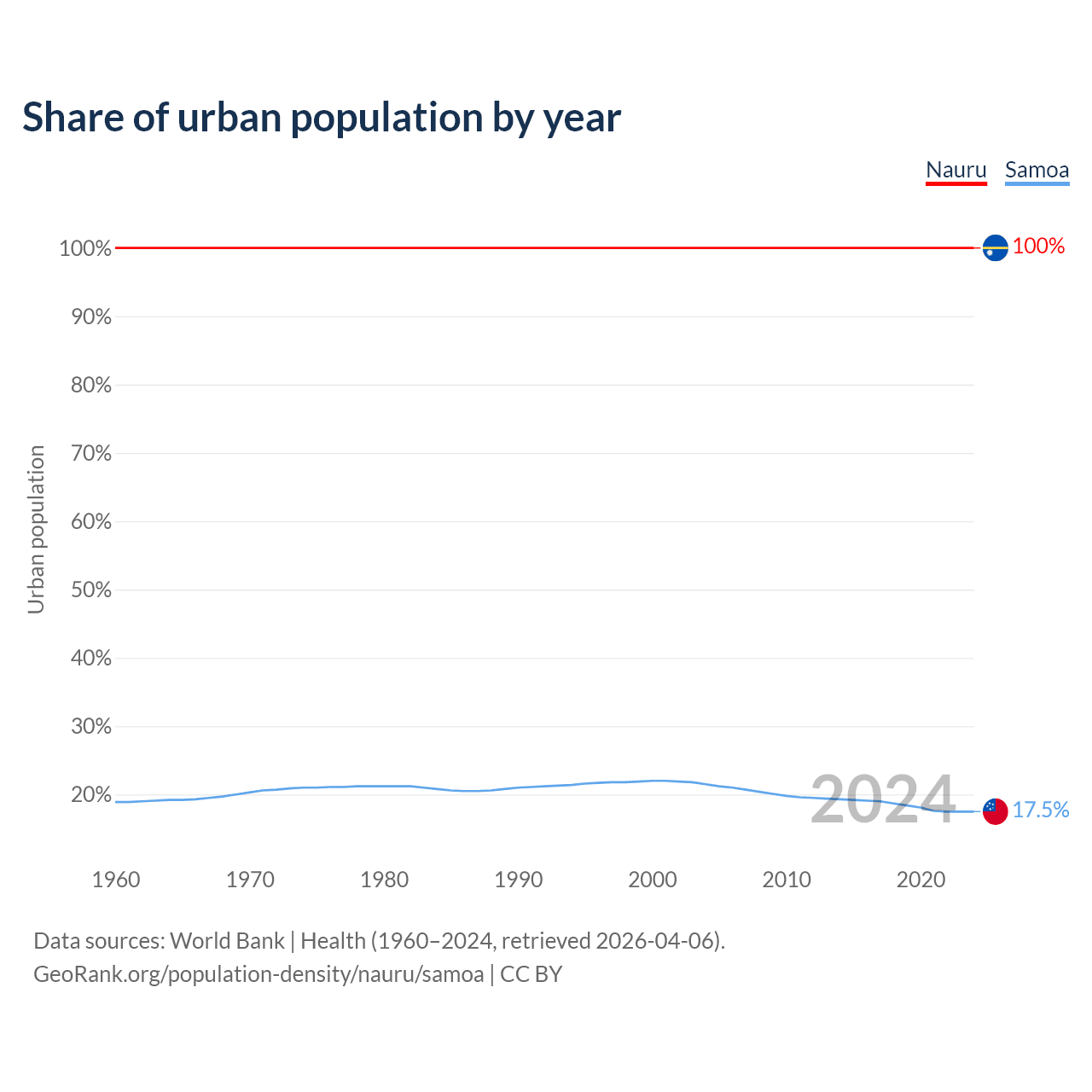 From 2004 to 2024, the share of urban population changed from 100% to 100% in Nauru and from 21.5% to 17.5% in Samoa.