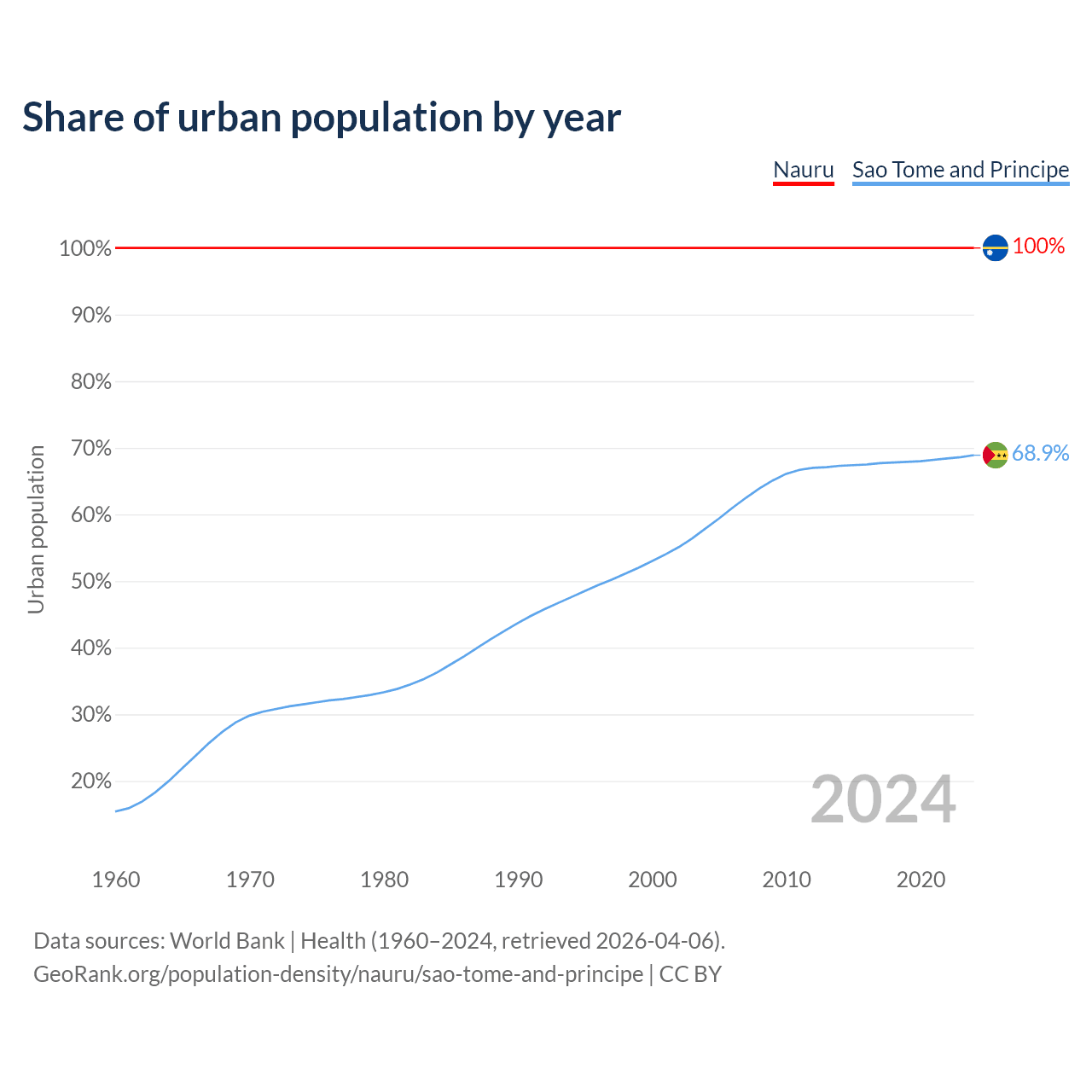From 2004 to 2024, the share of urban population changed from 100% to 100% in Nauru and from 57.9% to 68.9% in Sao Tome and Principe.