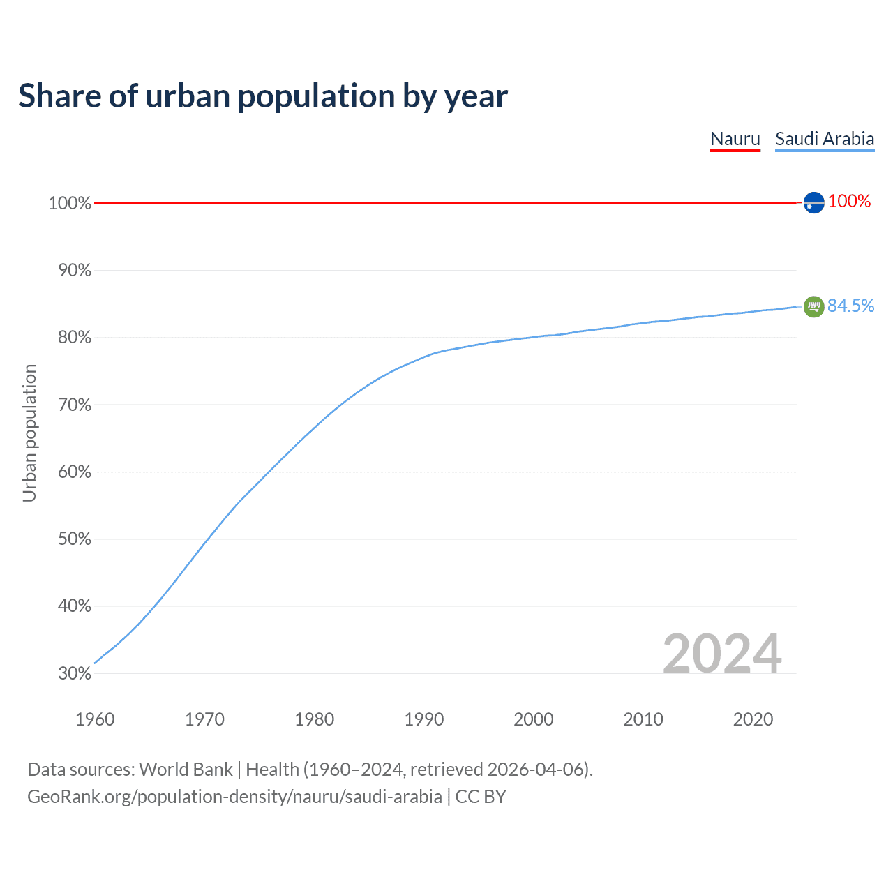 From 2004 to 2024, the share of urban population changed from 100% to 100% in Nauru and from 80.8% to 84.5% in Saudi Arabia.