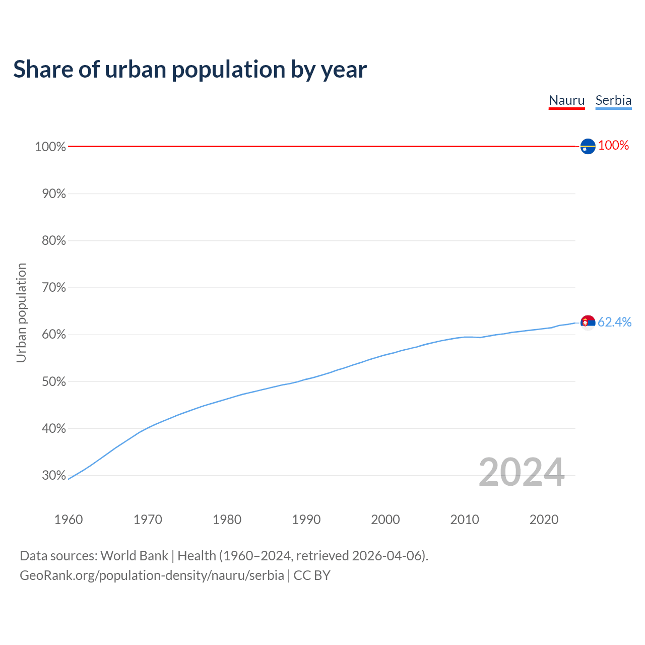 From 2004 to 2024, the share of urban population changed from 100% to 100% in Nauru and from 57.3% to 62.4% in Serbia.